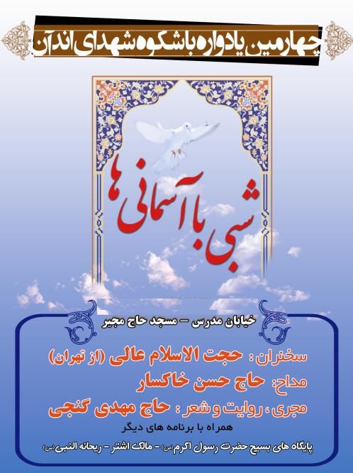 به گزارش والفجر؛ چهارمین یادواره شهدای محله اندآن، پنجشنبه شب این هفته برگزار خواهد شد. این برنامه باشکوه ماحصل کار مشترک بسیجیان محل از پایگاههای بسیج حضرت رسول اکرم(ص)، مالک اشتر و ریحانة النبی است. به گفته مسئول فرهنگی پایگاه بسیج رسول اکرم جلسات تصمیم سازی و تهیه مقدمات این مراسم، از اوایل تابستان آغاز شده و هماهنگیهای لازم برای هر چه باشکوه تر برگزار شدن یادواره فراهم شده است. یادواره های سالهای قبل در مساجد امام خمینی(ره)، مصلی و رضویه برگزار شده و مراسم امسال در مسجد حاج مجیر اجرا خواهد شد. با پیگیری هایی که مسئولین این مراسم انجام داده اند از سخنران، مجری و مداح کشوری در این مراسم استفاده خواهد شد.