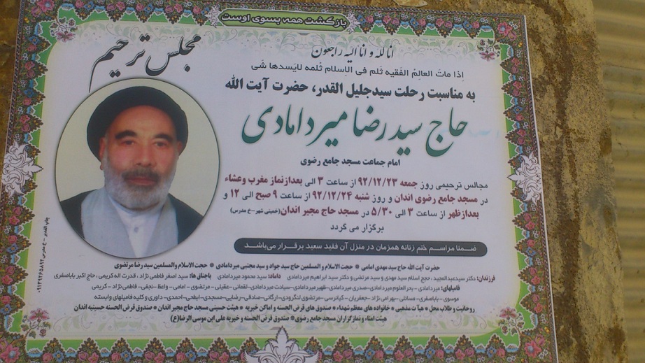 حضرت آیت الله حاج سید رضا میردامادی، امام جماعت مسجد رضوی، عصر روز گذشته در سن هشتاد سالگی دار فانی را وداع گفت و به دیار باقی شتافت. حاج سید رضا میردامادی از نوجوانی در حوزه های علمیه اصفهان دروس طلبگی تلمذ می کرد و بعدها در همین مدارس، دروس خارج از فقه را به طلاب تدریس می کرد.